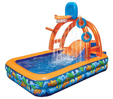 استخر بادی بزرگ با طرح پارک آبی مخصوص بازی و تفریح کودکان استخری بسیار مهیج و زیبا تولید شده توسط شرکت Banzai می باشد و از طراحی و ظاهر بسیار خاص نوآورانه ای در ساخت آن استفاده شده است. بخش اصلی بدنه این استخر بادی از ترکیب رنگی نارنجی روشن، تیره و آبی ساخته شده است که هارمونی بسیار چشم نوازی ایجاد می کند و رنگ های روی بدنه نیز به گونه ای هستند که توجه هر کودک را به خود جلب می کنند. این استخر با طول 223 سانتی متری و عرض 135 سانتی متر فضای مناسب و خوبی را برای بازی و تفریحات چند کودک به صورت همزمان فراهم می کند. این استخر مناسب استفاده کودکان از سن 2 سالگی تا 15 سالگی بوده و همراه آن نیز چند حلقه بادی برای بازی کودکان وجود دارد. در قسمت بالایی این استخر بادی یک تور بسکتبال بادی نیز قرار داده شده است که برای سرگرمی و ورزش کودکان می تواند مورد استفاده قرار گیرد