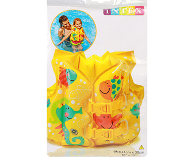 جلیقه بادی شنا کودک یکی از محصولات تولید شده توسط برند اینتکس می باشد که از زیبایی و کیفیت بدنه بی نظیر بهره میبرد. جلیقه نجات دارای طراحی بدنه زیبا و کودک پسندانه بوده که توجه هر کودکی را به خود جلب می نماید و برای قرار گیری در آب و شنا مشتاق می نماید. این جلیقه بادی یک محصول تفریحی و آموزشی برای کودکان 3 تا 6 سال بوده که می توانند در کنار والدین خود در آب قرار گیرند و دیگر ترس از آب نداشته و بازی و تفریح سرگرم باشند. جلیقه بادی کودک قابل استفاده بر روی آب های آرام تحت نظارت بزرگسالان بوده که از ایمنی بالایی برخوردار می باشد . جلیقه شنا نجات کودک ساخته شده از pvc با روکش طرح چرم می باشد که دارای ضخامت لایه ای مناسب بوده که می تواند تا حداکثر 23 کیلوگرم وزن را تحمل نماید و با داشتن دو محفظه باد به راحتی و با تعادل کامل کودک را روی آب نگه دارد. جلیقه بادی کودک دارای وزن بدنه بسیار سبک 300 گرمی داخل جعبه بسته بندی با ابعاد کوچک شامل 24 سانتی متر × 16 سانتی متر × 1.5 سانتی متر قرار داده شده است که در مدت زمان بسیار کوتاه توسط پمپ باد دستی راه اندازی می گردد و پس از باد شدن دارای ابعاد 41 سانتی متر × 30 سانتی مترمی باشد. جلیقه بادی کودک دارای رنگ بدنه زرد با طرح های کارتونی دریایی می باشد که دارای رنگ های شاد و دلنشین بوده و کاملا استاندارد و بی خطر بدون مواد مضر و سمی برای کودکان می باشد.