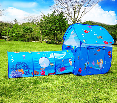 چادر بازی کودک طرح کلبه موجودات دریایی یکی از زیبا ترین و جدیترین چادر های بازی این شرکت می باشد که در سال 2019 طراحی و تولید شده است و تا کنون توانسته توجه بسیاری از کودکان را به خود جلب نماید این چادر بازی با طراحی بدنه بی نظیر شبیه کلبه زیر دریا پر از موجودات دریایایی همراه با تونل زیر دریایی می باشد که برای کودکان بسیار جذاب و سرگرم کننده بوده و می توانند استعداد ها و تخیلات خود را در محیطی امن و شخصی ابراز نمایند. چادر بازی کودک می تواند یک هدیه مناسب و هیجان انگیز برای کودکان سنین 2 تا 8 ساتل باشد و کودکان را بسیار خوشحال نماید. چادر بازی کودک از دو قسمت تونل و کلبه بازی طراحی شده است که قابلیت جدا شونده دارد که در صورت نداشتن فضا می توانید این قسمت را از چادر بازی جدا نمایید، کلبه بازی دارای رنگ بدنه آبی آرامش بخش می باشد که در روحیه کودکان تأثیر بسزایی دارد همچنین بدنه این چادر بازی پر از موجودات دریایی و اقیانوسی بوده که هر کدام دارای رنگ شاد و جذابی برای کودکان می باشد و توجه آن ها را جلب می نماید و کودکان می توانند بسیاری از حیوانات دریایی زیبا را در چادر پیدا کنند. چادر بازی کودک از راه اندازی سریع و آسان بهره می برد و تنها کافیست محصول را از ساک حمل خارج نموده و با چند حرکت کوتاه و سریع چادر بازی کودک را باز نمایید که می توانید از دفترچه راهنما استفاده نمایید. چادر کودک طرح دار ساخته شده از پلی استر ضد آب و مقاوم می باشد که دارای میله های انعطاف پذیر از فایبر گلاس ضد زنگ می باشد که کاملا با دوام و پایدار بوده و می تواند در بسیاری از محیط ها مانند منزل ، پارک ، مسافرت ، مهد کودک ، حیاط و … مورد استفاده کودکان باشد. پادر کودک طرح کلبه می تواند یک محصول سرگرم کننده برای آن ها باشد که درون چادر به بازی با دوستان خود مشغول باشند و بسیاری از فعالیت ها شامل : نقاشی، خمیر بازی ، خواندن کتاب داستان و حتی به خواب و استراحت بپردازند. این چادر کودک دارای یک درب ورودی و دیواره های بالایی توری می باشد که علاوه بر جریان هوا والدین می توانند بر کودک خود نظارت داشته باشند و در صورت استفاده در فضای باز و مسافرت ها از ورود حشرات به درون چادر جلوگیری می نماید..